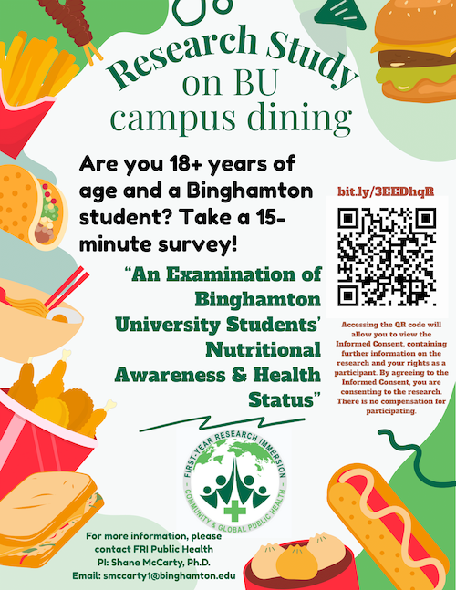 Study Title: Examining the Nutrition and Health Status of Binghamton Students and Broome County Residents Researchers: Anna Vishnevetsky, Kaitlyn Zerrenner, Ryan Horowitz, Vidhu Kumar, Josephine Janas, Carolyn Ko, Danica Lyktey, Kayla Rogan, and Shane McCarty, PhD., Binghamton University